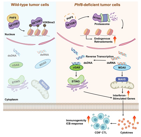 接下来,作者探究了PHF8缺失引发抗肿瘤免疫效应的分子机制。实验结果表明,PHF8缺失可促进细胞核内H3K9me3甲基转移酶SETDB1的特异性降解,从而降低染色质抑制性甲基化标志H3K9me3水平,激活H3K9me3修饰的逆转录转座子的表达。随后,这些激活的逆转录转座子双向转录形成dsRNA或dsDNA,并在细胞质中积累,激活内源核酸感受信号通路和干扰素应答信号通路,最终诱发抗肿瘤免疫应答和肿瘤生长抑制效应。