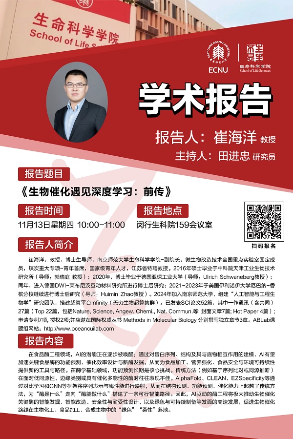 崔海洋,教授,博士生导师,南京师范大学秀人网 -副院长,微生物改造技术全国重点实验室固定成员,煤炭重大专项-青年首席,国家级青年人才,江苏省特聘教授。2016年硕士毕业于中科院天津工业生物技术研究所(导师:郭瑞庭 教授);2020年,博士毕业于德国亚琛工业大学(导师:Ulrich Schwaneberg教授);同年,进入德国DWI-莱布尼茨互动材料研究所进行博士后研究;2021-2023年于美国伊利诺伊大学厄巴纳-香槟分校继续进行博士后研究(导师:Huimin Zhao教授)。2024年加入南京师范大学,组建“人工智能与工程生物学”研究团队,搭建超算平台Infinity(无穷生物超算集群)。已发表SCI论文52篇,其中一作通讯(含共同)27篇(Top 22篇,包括Nature, Science, Angew. Chemi., Nat. Commun.等; 封面文章7篇; Hot Paper 4篇);申请专利7项, 授权2项;并应邀在国际权威丛书 Methods in Molecular Biology 分别撰写独立章节3章。