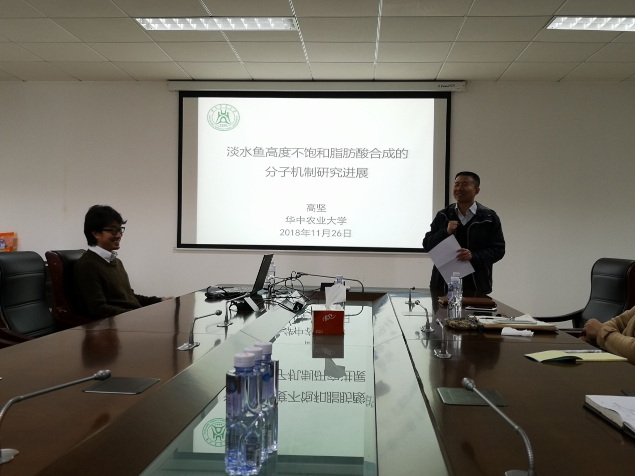 2018年11月26日上午,华中农业大学水产学院高坚教授应邀访问秀人网 ,并在秀人网 534小会议室做学术报告,报告题目为《淡水鱼高度不饱和脂肪酸合成的分子机制研究进展》。本次报告由秀人网 杜震宇教授主持,动物学科相关师生聆听了本次报告。