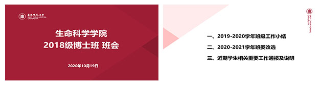 会议内容主要有2019-2020学年班级工作小结、2020-2021学年班委改选,以及近期学生相关重要工作通报与说明。首先,班长牛鑫代表班委总结了过去一年班级活动,去年9月,我们18级博士班委联合生物化学与分子生物学党支部举办了主题为“秀人网