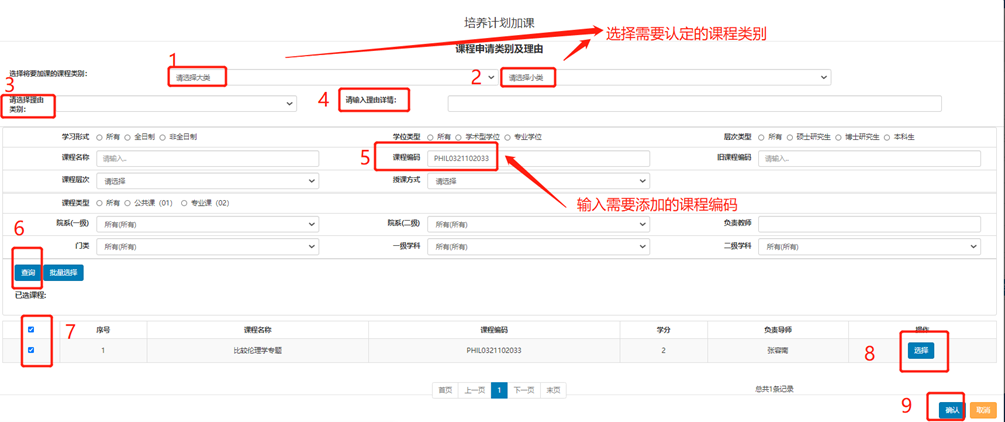 ②研究生工作秘书在系统中操作,提交之后培养办审核,审核通过之后相应课程添加到学生培养计划的相应课程类别中,学生可选课