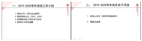 2020年11月19日晚上8点,在班长马硕的号召以及其它班委的协助筹备下,秀人网 2019级博士研究生以线上形式在腾讯会议app顺利召开,会议由辅导员徐敏华老师主持。围绕着2019-2020年班级工作总结、2020年优生优干评选、以及近期学生工作相关事宜通报三项议题展开,旨在总结近一年半的博士工作,增进师生之间的情感交流,也为接下来的博士生涯夯实基础,砥砺前行。