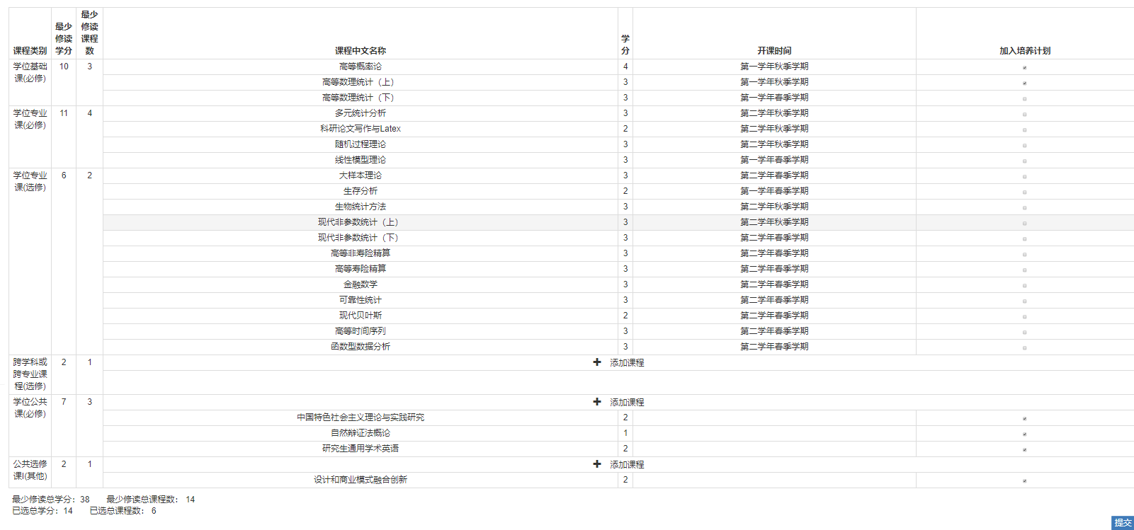 在培养方案已经分配好的情况下,学生可制定自己的培养计划,确定需修读的课程(在培养方案范围内),选择好课程后按提交按键保存培养计划,见图7