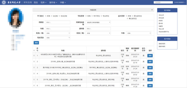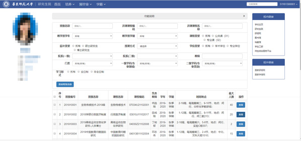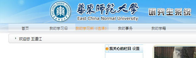 学生使用谷歌浏览器Chrome,由华师大的统一身份认证平台登录系统,地址是://idc.xiurenvip.net,使用学生自己的公共数据库账号和密码登录(见图1),登陆后访问“研究生系统”,选择点击“我的学习新(选课)”菜单(见图2),选择“学生”权限进入研究生院管理系统。