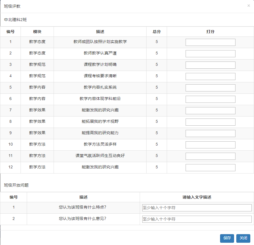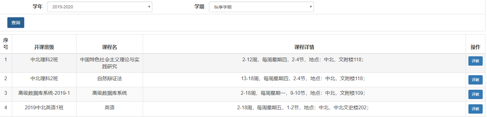 学生根据学年学期筛选某个学期所上的课,然后点击对应的评教按钮即可进入评教页面,见图19