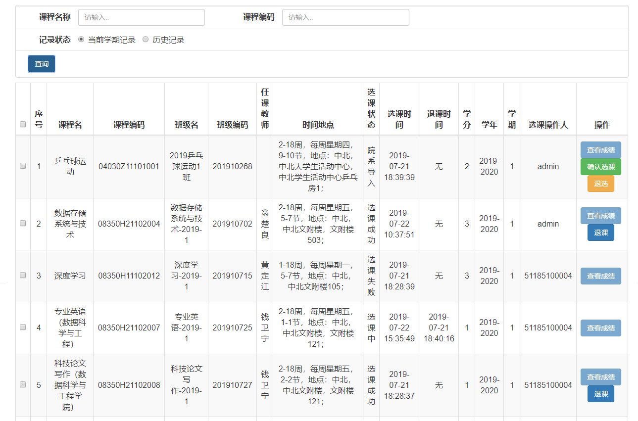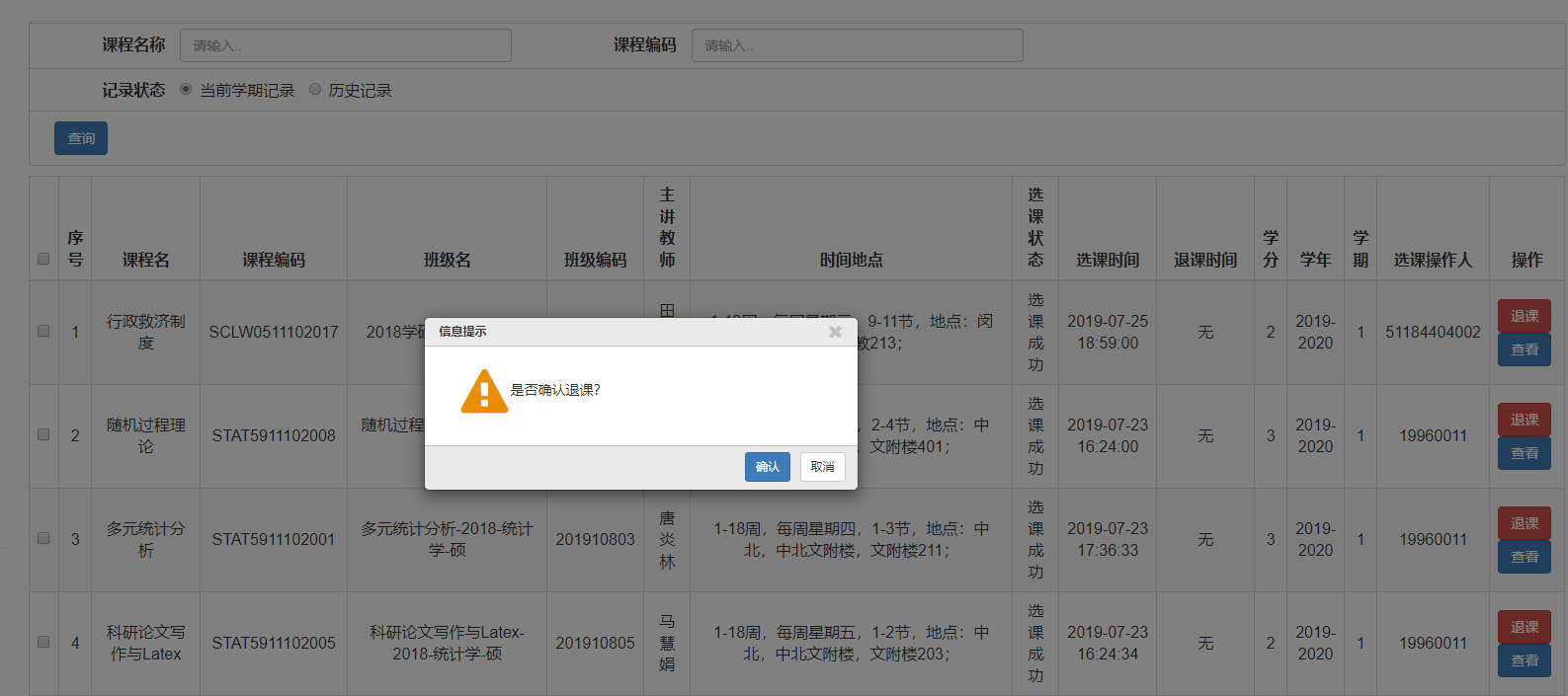 在选课成功后,可在“选课结果”中查询到当前学期和历史选课记录,见图14。可看到查询结果会有选课状态栏,学生选课状态共分为选课中、选课成功、选课失败、 退课、 院系导入五种状态,学生可在不同条件下,进行 “确认选课”、“退选”和“退课”的操作,学生在选课页面成功选课会将选课状态置为选课中,需要注意的是,在选课页面成功提交的记录并不代表选中,只是进入选课排队序列中,系统将会在后端进行处理,以先到先得的优先级决定学生选中该课程或是未选中,可在该页查询到选择课程的状态。选课成功的课程可选择退课,退课确认见图15,选课失败可在选课页面重新选课。选课为院系导入时学生可做“确认选课”和“退选”的操作,确认选课后才真正选课成功,退选则不会选择该课程。