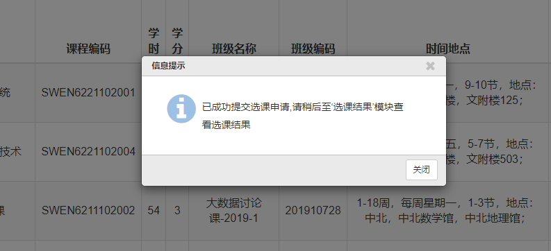 页面下半部分为根据条件查询得到的开课班级,根据班级可进行选课操作,点击操作中“选课”按钮,得到提交结果,如图12,对于已选中课程与已修读并考核通过的课程不可重复选课。也可以点击“查看”按键查看课程信息,见图13