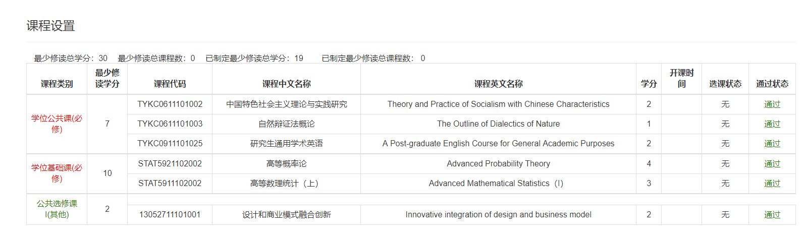 培养计划指的是在培养方案框架内,学生与导师商议后确定的个人培养计划(主要是课程设置)。在培养方案已经分配好的情况下,学生可查询自己的培养计划中的课程设置部分,查看本人研究生培养期间已经完成的课程和需要完成的课程,见图6