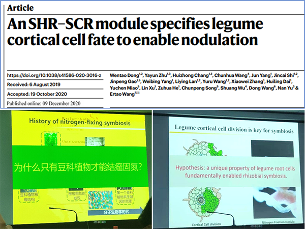 值得一提的是,继2017年在国际顶级期刊Science上发表关于“脂肪酸是植物与菌根真菌共生体系中碳源的主要传递形式”的重大发现3年后,于此次报告前一天2020年12月10日,王二涛研究员课题组在国际顶级期刊Nature上发表Article成果,研究揭示豆科植物皮层细胞获得SHR-SCR干细胞分子模块,使其有别于非豆科植物,从而回答了共生领域的另一世纪难题:“为什么只有豆科植物能与根瘤菌截瘤固氮”。本次报告中,与会老师和同学随着王老师的讲解,共同体会了这项成果发现过程中的起承转合以及8年不懈努力背后的趣事。