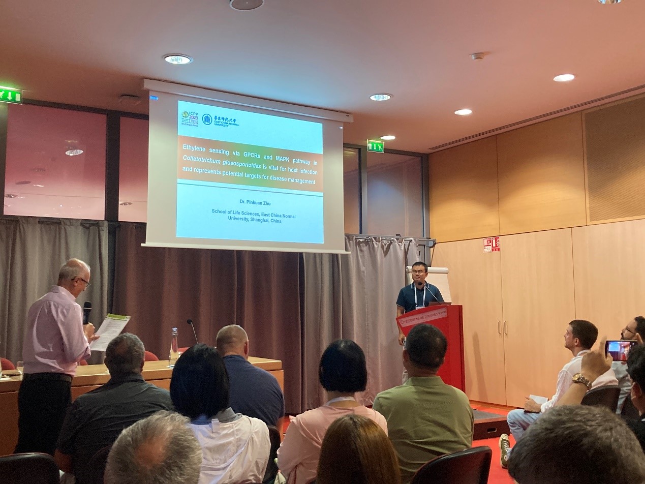 此次大会共有63个分会场、累计373位报告人。朱品宽副教授受邀在采收后病原菌与宿主及其微生物组互作的会场做了题为Ethylene sensing via GPCRs and Mapk pathway in Colletotrichum gloeosporioides is vital for host infection and represents potential targets for disease management的大会专题报告,该报告得到了国际知名植物病理学家荷兰瓦赫宁根大学Jan van Kan教授等多国学者的关注,会后朱品宽老师与各国学者展开了热烈的讨论。朱品宽副教授主要从事植物病原真菌的致病和毒力因子功能鉴定、果实采后病害响应环境因子的机理、以及果实病害防控和采后保鲜技术等方向的研究,此次大会报告的内容,主要揭示了病原真菌通过G蛋白偶联受体GPCRs和MAPK信号途径感应乙烯,对病原真菌的侵染力至关重要,可作为防控作物真菌病害的靶标。此次大会报告凸显了秀人网 在本领域的研究成果,受到国内外学者好评。