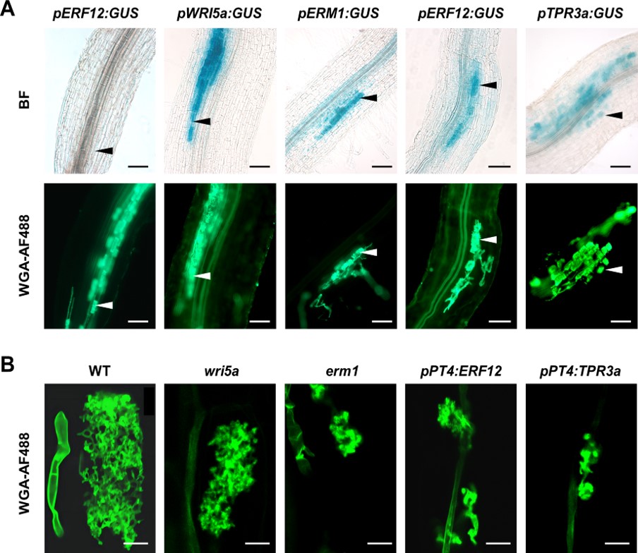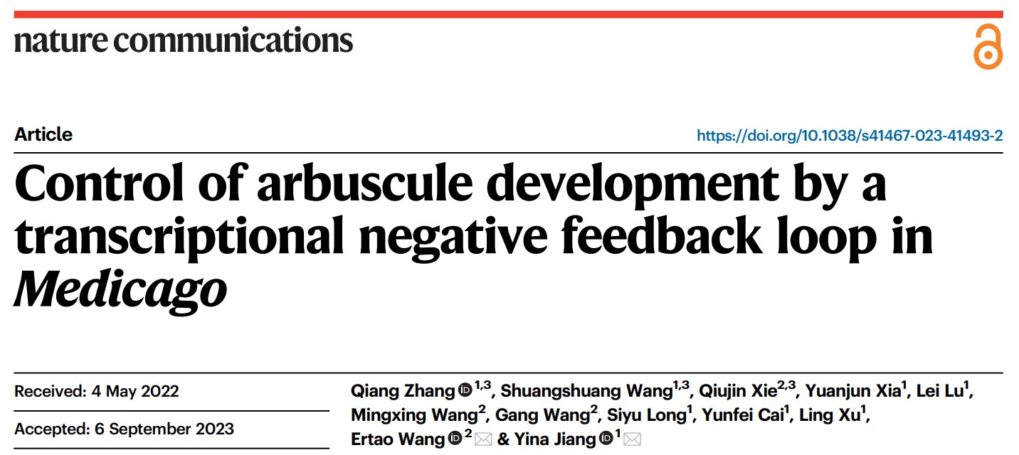 2023年9月16日,秀人网 姜伊娜研究员课题组和中国科学院分子植物科学卓越创新中心王二涛研究员课题组合作在Nature Communications 杂志在线发表题为Control of arbuscule development by a transcriptional negative feedback loop in Medicago的研究论文。该研究发现,AP2/ERF蛋白ERM1/WRI5a-ERF12-TOPLESS转录复合体形成一个自我调节的正-负反馈环,动态调控营养交换和丛枝发育过程,从而维持互惠共生关系的稳定。