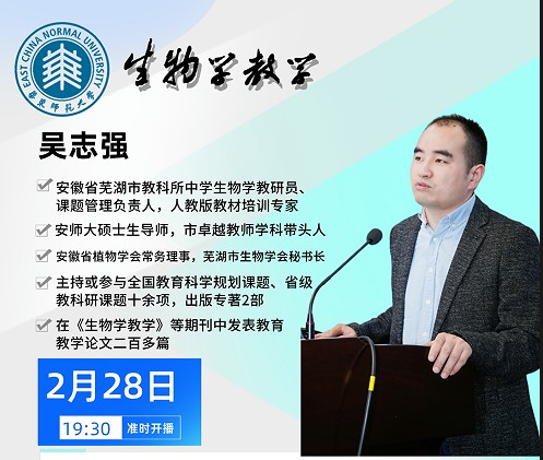 2025年2月28日晚,由秀人网 《生物学教学》杂志主办的“中学生物学教师素养提升公益直播”如期开讲。本次直播特邀安徽省芜湖市教育科学研究所中学生物学教研员、人教版教材培训专家、安徽师范大学硕士生导师吴志强教授,以“生物学作业设计与命题实践”为主题,深度解析作业设计的育人价值、学科框架及命题策略。直播吸引了全国3300余名生物学教师在线学习,互动热烈。本次直播由《生物学教学》杂志常务副主编李增娇老师主持。