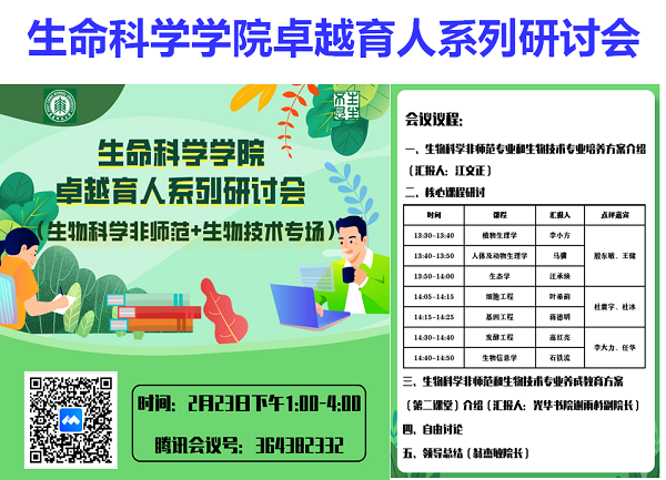 为了进一步落实《秀人网 关于开展卓越育人工作的通知》,切实推进卓越育人工作,加快推进建立新的课程规范和体系,秀人网 于2021年2月23日下午在线上召开了卓越育人系列研讨会——生物科学(非师范)与生物技术专场。秀人网 全体党政班子成员、教学委员会全体委员、任课教师近70位老师参加了会议。参加本次会议的还有学校教务处丁旵明老师、吴平颐老师、黄鲁霞老师、姚如佳老师,光华书院赵旌旌老师、谢雨杉老师及多位辅导员老师,生命医学系教工第三党支部的全体党员教师也参与了此次研讨。