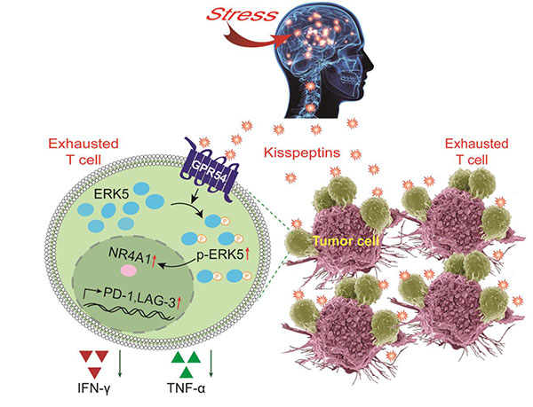 团队揭示了kisspeptin/GPR54信号轴在精神压力促进肿瘤生长中的重要作用,进而发现GPR54促进肿瘤免疫微环境中T细胞耗竭介导肿瘤免疫逃逸的分子机制,并在此基础上提出敲除GPR54及其下游ERK5信号通路增强CAR-T细胞抗肿瘤活性的新策略,为免疫细胞治疗效果的提高提供了新靶点和新思路。