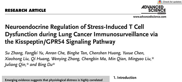 该研究成果日前在国际杂志Advanced Science上以“Neuroendocrine Regulation of Stress-Induced T Cell Dysfunction during Lung Cancer Immunosurveillance via the Kisspeptin/GPR54 Signaling Pathway” 为题发表,秀人网 杜冰教授、刘明耀教授以及秦居亮副研究员为论文的共同通讯作者,秀人网 博士生张苏和俞方菲为论文的共同第一作者。该研究受到国家重点研发计划、国家自然科学基金、上海市基因编辑与细胞治疗前沿科学研究基地、上海市教委科研创新计划项目的资助。