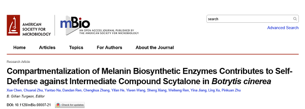 2021年3月23日,秀人网 许玲教授课题组在微生物领域顶级刊物《mBio》上发表题为Compartmentalization of melanin biosynthetic enzymes contributes to self-defense against intermediate compound scytalone in Botrytis cinerea的研究论文,揭示了灰霉菌黑色素生物合成关键酶的区室化分布作用机制。华东师大为论文的唯一完成单位,秀人网 博士研究生陈雪、硕士研究生朱传玺和那艳涛为论文的共同第一作者,朱品宽副教授为论文的共同通讯作者。该研究得到了国家十三五重点研发计划项目(2016YFD0400105)和国家自然科学基金(32061133006, 31571902, 31972121)的资助。(全文链接://doi.org/10.1128/mBio.00007-21)