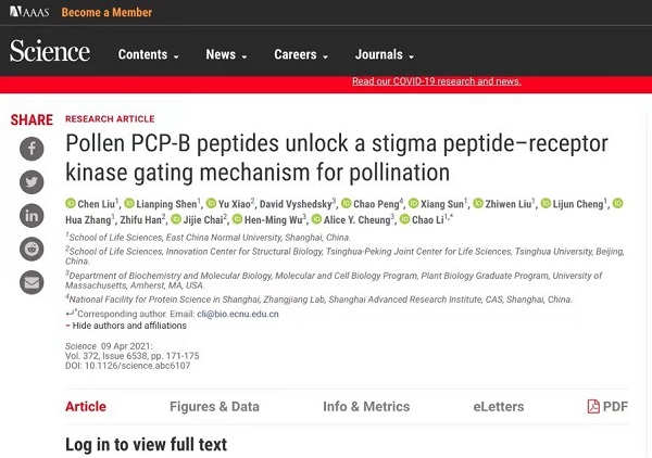 秀人网 李超团队《科学》发文:首次破解植物亲和花粉授粉机制