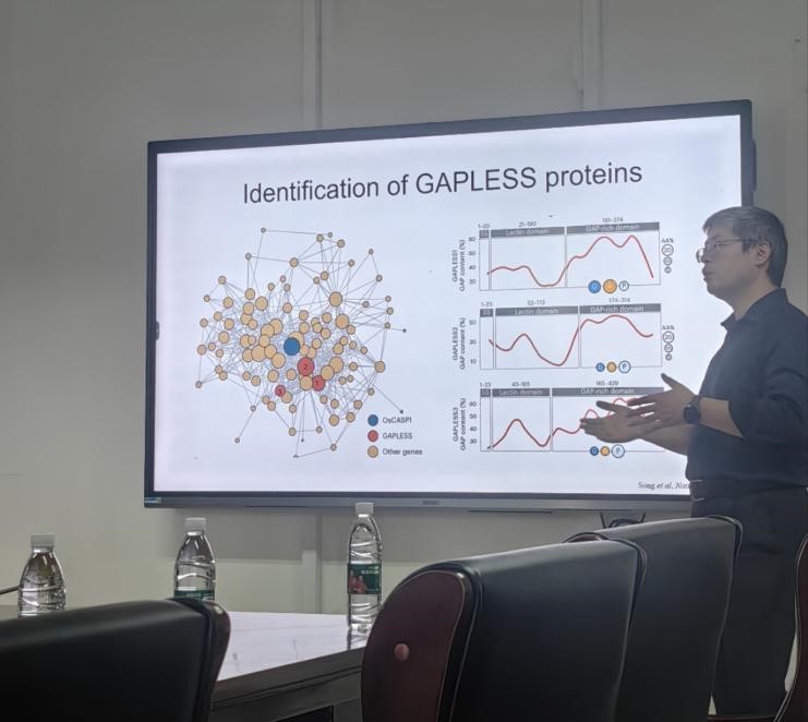 进一步地,晁老师以其团队最近在《Science》《Nature Plants》等杂志上发布的研究成果,详细地为我们讲解了植物离子平衡的调控机制。其中有关GAPLESS和ESB1的报道令人耳目一新。GAPLESS蛋白是一种调控植物离子稳态的关键蛋白。在水稻中,GAPLESS能够结合细胞壁形成复合体从而保证细胞质膜和细胞壁的紧密结合。然而,GAPLESS蛋白并不是在所有植物中都存在。在拟南芥中ESB1也具有类似的功能,同时,GAPLESS蛋白在拟南芥中表达也能起到与ESB1相似的功能。ESB1家族蛋白在拟南芥中还介导CS-CSD的附着。
