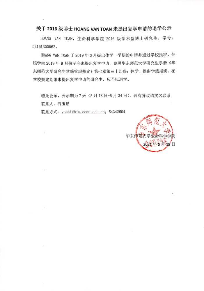 关于2016级博士HOANG VAN TOAN未提出复学申请的退学公示