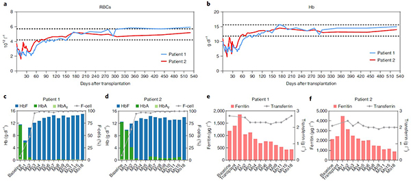 该试验将基因编辑的自体造血干祖细胞(HSPCs)移植到两名儿童患者体内,其中一名患儿基因型为β0/β0,被列为最严重的TDT类型;另外一例接受治疗的患儿也属于TDT。截至文章投稿时,两名患儿的胎儿血红蛋白分别从基线时的2.55g/L、1.75g/L分别上升至最近一次访视的149g/L和139g/L,最近一次访视时的总血红蛋白含量分别为152g/L和140g/L。截至文章投稿时,两例患者在治疗后都实现了脱离输血依赖超过16个月,脱离输血依赖的定义为为输血的情况下总血红蛋白达到或超过90g/L。移植后第9个月时的骨髓细胞中的编辑率分别为85.46%和89.48%。患者在移植后分别于 52 天和40 天出院,最近一次访视时临床状况良好。清髓预处理相关毒性较轻,不良反应包括 1-2 级粘膜炎、1 级皮疹和 2 级鼻出血。细胞移植之后没有发生严重的感染,铁过载情况也有明显改善。两名患者的红细胞数量和总体血红蛋白水平在第 45 天左右开始稳定增加,在第 75 天左右达到健康水平。截至日前,两例受试者脱离输血依赖均已超过24个月。