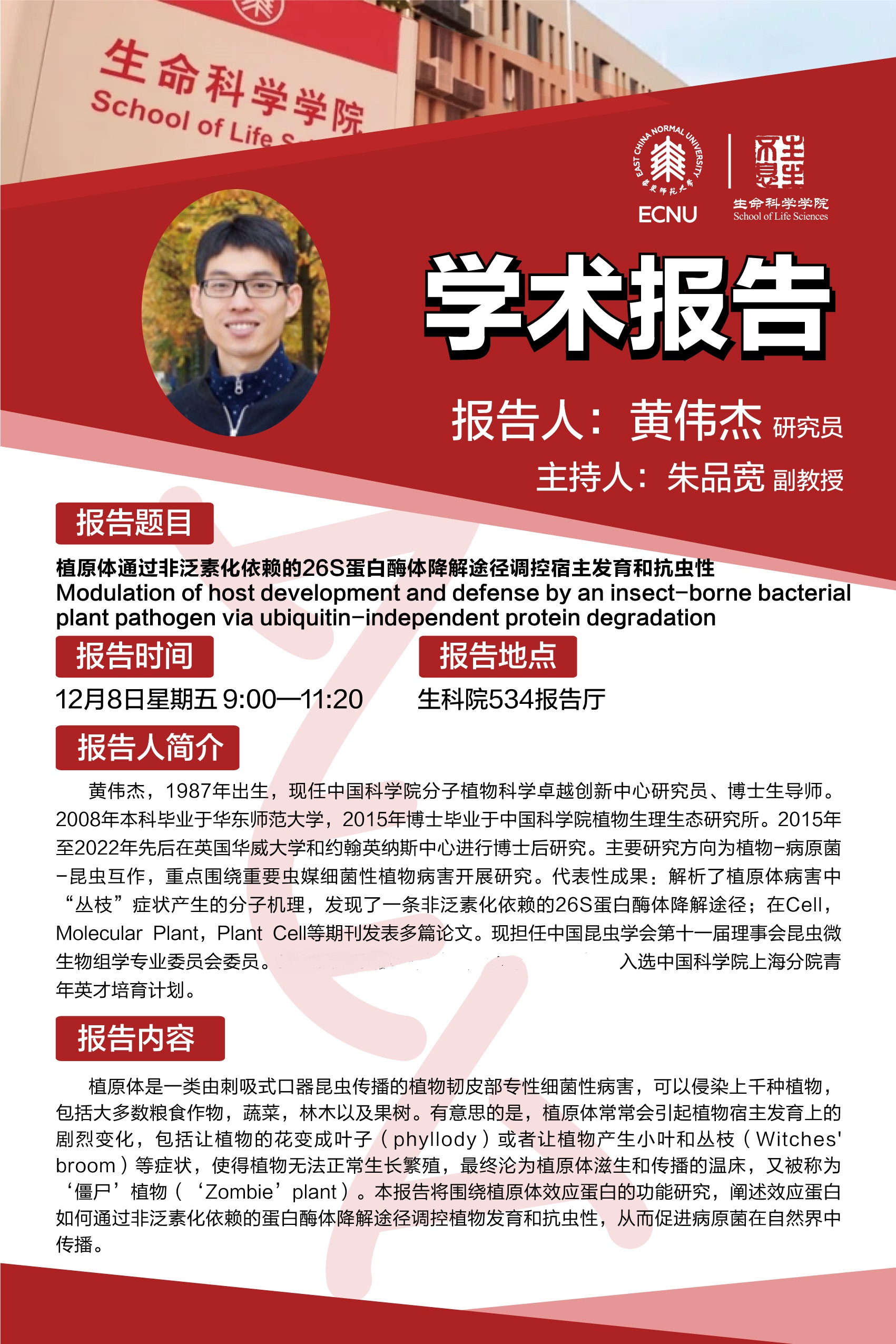 植原体是一类由刺吸式口器昆虫传播的植物韧皮部专性细菌性病害,可以侵染上千种植物,包括大多数粮食作物,蔬菜,林木以及果树。有意思的是,植原体常常会引起植物宿主发育上的剧烈变化,包括让植物的花变成叶子(phyllody)或者让植物产生小叶和丛枝(Witches' broom)等症状,使得植物无法正常生长繁殖,最终沦为植原体滋生和传播的温床,又被称为‘僵尸’植物(‘Zombie’plant)。本报告将围绕植原体效应蛋白的功能研究,阐述效应蛋白如何通过非泛素化依赖的蛋白酶体降解途径调控植物发育和抗虫性,从而促进病原菌在自然界中传播。