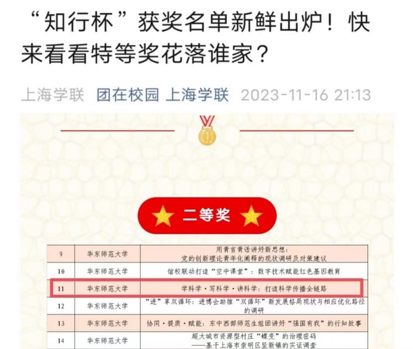 2023年11月11日,由团市委、市委宣传部、市教卫工作党委、市教委、市精神文明办、市人大社会委、市政协社法委和市学联联合主办的2023年“知行杯”上海市大学生社会实践大赛决赛在华东理工大学成功举行。秀人网 共六个项目进入决赛环节,其中秀人网 实践团队项目《学科学·写科学·讲科学:打造科学传播全链路》在此次 “知行杯”大赛中表现优异,斩获上海市二等奖!