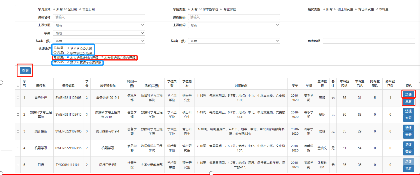 学术学位研究生课程分别从以下四个途径进行选课:(1)公共课:学术学位公共课;(2)公选课:学术学位公选课;(3)专业课:本人培养计划内课程/本专业培养方案内课程(2022级新生暂未制定培养计划,选择“本专业培养方案内课程”;2021级老生选择“本人培养计划内课程”),该模块主要选择学位基础课(必修)、学位专业课(必修)、学位专业课(选修)等专业课程;(4)跨选课:跨学科或跨专业选修课。