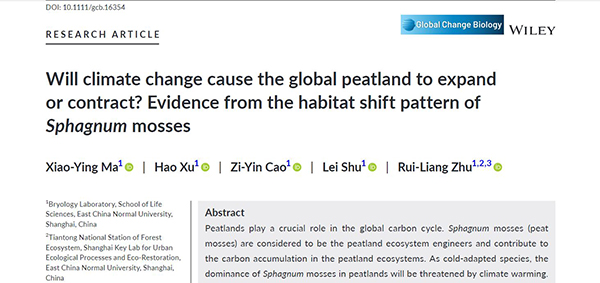该成果以“Will climate change cause the global peatlandto expand or contract? Evidence from the habitat shift pattern ofSphagnummosses”为题于7月28日在线发表在 Global Change Biology 。论文的第一作者为博士研究生马晓英,通讯作者为秀人网 朱瑞良教授,硕士生徐浩和曹子寅以及舒蕾讲师参与了本项研究。