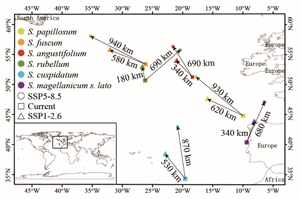 和现代相比,2070年不同气候情境下泥炭藓物种适宜分布区的质心变化