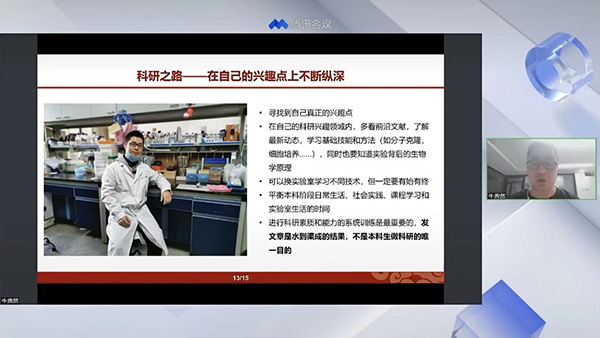 牛煦然同学结合自己本科期间的学习以及在李大力老师课题组的科研经历,分享了有关课堂知识学习的经验以及在科研项目开展中的心得。关于课堂学习,他认为要重视基础知识,学会带着思考和问题学习,合理地利用笔记,做到有针对性地对重难点进行整理和消化,打好坚实的理论基础。此外,也要具有前沿视野,做好文献阅读,对生命科学领域的最新进展保持密切的关注。他认为课堂学习是多元而平衡的,不能拘泥于他人的经验,要寻找适合自己的学习方法,要重视好数理化课程,利用好秀人网 优厚的人文资源来丰富自己的身心内涵,做到文理平衡。他还提到,本科阶段的课程知识是未来科学研究的知识储备,只有学好基础才能立足前沿。关于科研项目的开展,他建议大家要寻找到自己真正的兴趣点,多看前沿文献,了解最新动态,学习基础技能和方法,深究技术背后的生物学原理,在自己的兴趣点上做到有恒心、有毅力、不断地纵深学习,做到有始有终。最后,他希望同学们要珍惜在师大的美好时光,将自己对青春的诗,写在属于师大的那一页,将对生命科学的热爱融进诗的字里行间。