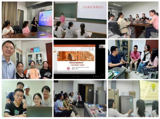 图为学院教师与师范生开展线上线下的微课设计讨论