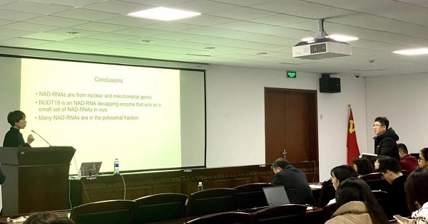 随后,陈教授深入探讨了RNA 5’端加帽修饰的前沿研究进展,特别是与非典型RNA 5’端加帽修饰相关的内容。她以清晰易懂的方式介绍了NAD-capped RNAs的分子结构、空间分布、基因特征以及生物功能,同时还分享她课题组特异性检测NAD-capped RNAs的创新方法及其去帽机制。此外,她还展示了Nudix家族蛋白NUDT19的最新研究成果,这一成果为解析非典型RNA 5’端帽子修饰技术提供了重要的科研支撑。