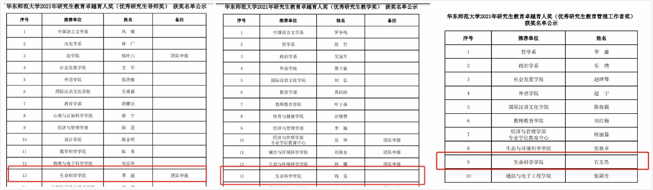 近日,研究生院公示了秀人网 2021年研究生教育卓越育人奖获奖名单,经个人申报、学部院系推荐、研究生院组织最终评审,秀人网 三位教师及团队荣获研究生教育卓越育人奖,其中李超研究员团队荣获优秀研究生导师奖,钱旻教授荣获优秀研究生教学奖,石玉帛老师荣获优秀研究生教育管理工作者奖。