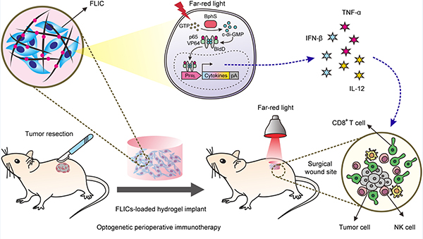 华东师大秀人网 叶海峰团队利用合成生物学造物致用的思想,巧妙地融合了光遗传学技术、肿瘤手术切除疗法以及肿瘤免疫疗法,开发了一种光控细胞药物工厂,实现远红光可控的、可长期按需调控释放免疫治疗剂的免疫调节工程细胞(FILC)。将该工程细胞包裹于生物相容性极高的水凝胶中,在肿瘤手术切除后植入切除部位,通过远红光光照两小时即可控制表达释放免疫调节细胞因子IFN-β,TNF-α,IL-12,从而调动小鼠自身免疫系统杀伤残余的肿瘤细胞,防止肿瘤复发和转移。