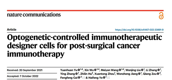 上述研究成果于2022年10月26日以“Optogenetic-controlled immunotherapeutic designer cells for post-surgical cancer immunotherapy”为题在 Nature Communications 期刊上发表,该研究开发的远红光调控的新型肿瘤免疫疗法既可以解决肿瘤手术切除疗法易复发和转移的问题,也可以避免肿瘤免疫疗法起效慢以及不可控性产生的非特异性过度激活问题,显著地提高肿瘤手术切除治愈率。该疗法开启了免疫抗癌新思路,同时也扩展了光控系统在生物医学领域的应用,具有潜在的临床转化意义。