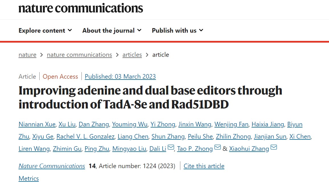 2023年3月3日,秀人网 /上海市基因编辑与细胞治疗前沿科学基地张晓辉(现为中国医学科学院苏州系统医学研究所PI)、钟涛和李大力,在《自然通讯》杂志上发表了题为 “Improving adenine and dual base editors through introduction of TadA-8e and Rad51DBD” 的科学论文。开发了具有超高活性的腺嘌呤单碱基编辑器 (hyABE),极大地提高了靠近PAM区A-to-G的转换效率,扩大了编辑窗口。同时,作者又研发了超高活性的嘌呤嘧啶双碱基编辑器(eA&C-BEs和hyA&C-BEs),大幅提高A-to-G和C-to-T(A/C)同时编辑效率,并首次证明在斑马鱼胚胎中具有A/C同时编辑功能,展现了新型腺嘌呤碱基编辑器 hyABE在构建点突变疾病模型中的优势。