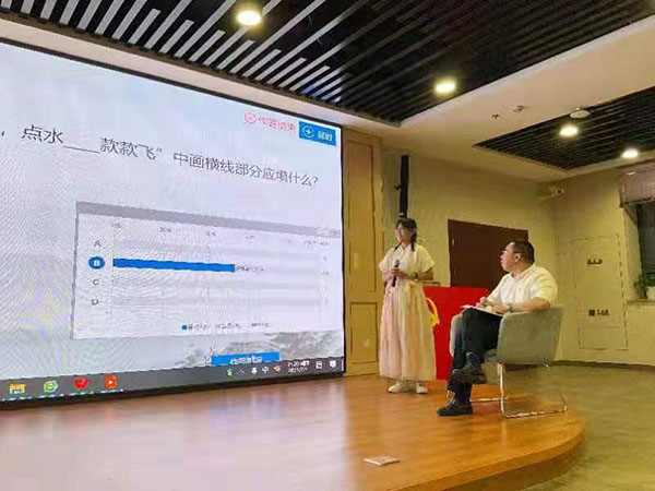 在同学们的热情与期待中,首先是辅导员张子怡老师主持开场。接下来进入到正式 的攻擂赛,四位攻擂者通过摇色子的方式决定出场顺序,每位攻擂者将面临五道题,同时台下的百人团也可在线进行作答,攻擂者得分以百人团答错人数决定。在攻擂者紧张作答的同时,台下百人团也在争分夺秒答题。