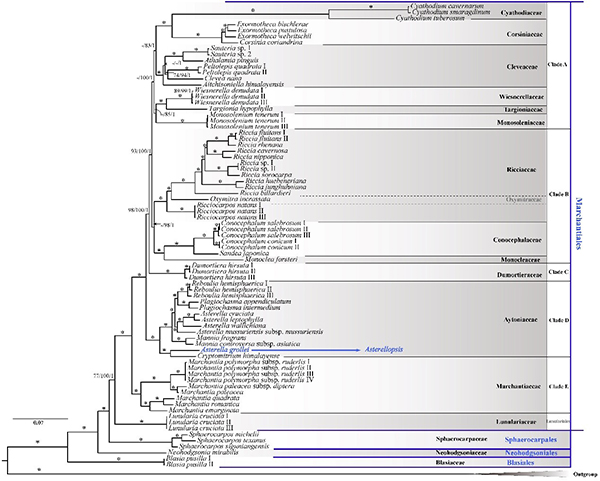 图2.依据氨基酸联合矩阵的地钱纲贝叶斯系统树框架。枝上代表支持率依次为 MP-BS, ML-BS和BPP。星号代表均获得最高支持率。