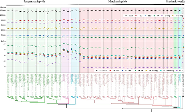 图4. 苔类植物门三个纲(地钱纲,叶苔纲,裸蒴苔纲)叶绿体全基因组,LSC区域,SSC区域和IR区域的基因大小和组成结构的比较,地钱纲按照从右到左的顺序:壶苞苔目Blasiales,新地钱目Neohodgsoniales,囊果苔目Sphaerocarpales,地钱目Marchantiales。