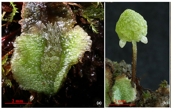 图3.在我国和尼泊尔分布的拟花萼苔属外形,a雄株,b雌株,摄自我国青海。