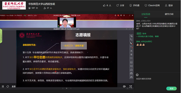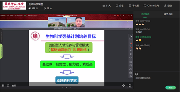 在直播的最后阶段,是考生家长或考生线上互动交流环节。考生或家长对生物技术和生物科学的区别和就业前景、菁英班和强基计划入选的条件和机制、普通班的学生中途是否有机会进入菁英班或强基计划、转专业、以及非师范生能否考教师资格证等问题,江老师都一一进行了解答。尤其今年首次招生的生物科学“强基计划”,考生和家长都给予了极大的关注。