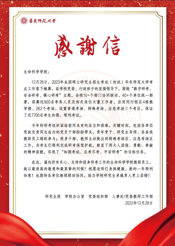 这次考试,不但是对考生们的考试,更是对教育工作者的一次考验。逆风而行、迎难而上、尽职尽责,正是生科人“生生不息”的写照,他们用实际行动践行师德模范、谱写出教育工作者的无私大爱与责任担当!