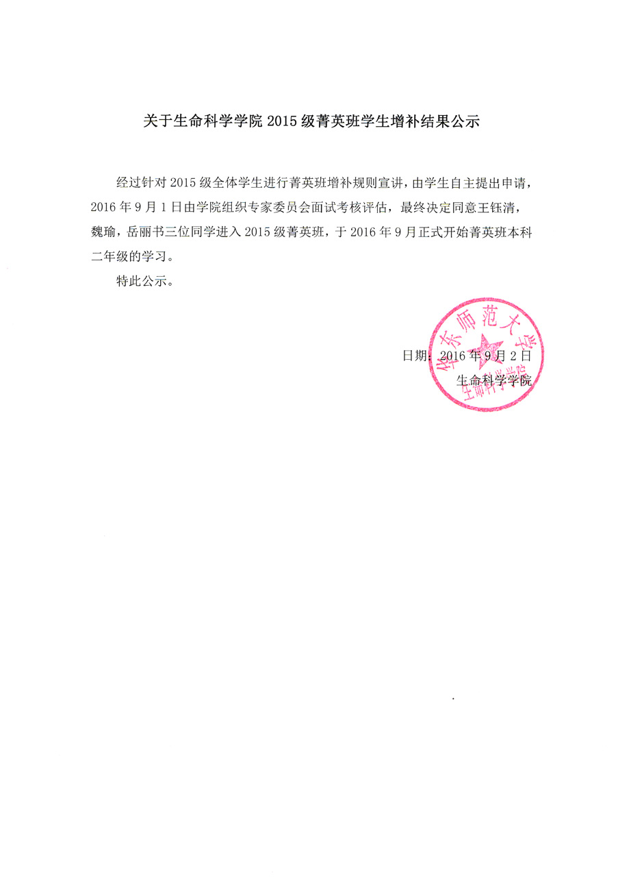 经过2015-2016学年第二学期末针对全体2015级学生进行菁英班准入规则宣讲,通过年级群发布准入申请与面试通知,由学生自主提出申请,2016年9月1日由学院组织专家委员会面试考核评估,最终决定同意王钰清,魏瑜,岳丽书三位同学进入2015级菁英班,于2016年9月正式开始菁英班本科二年级的学习。将面试结果通过秀人网 公告栏以及2015级年级群进行公示: