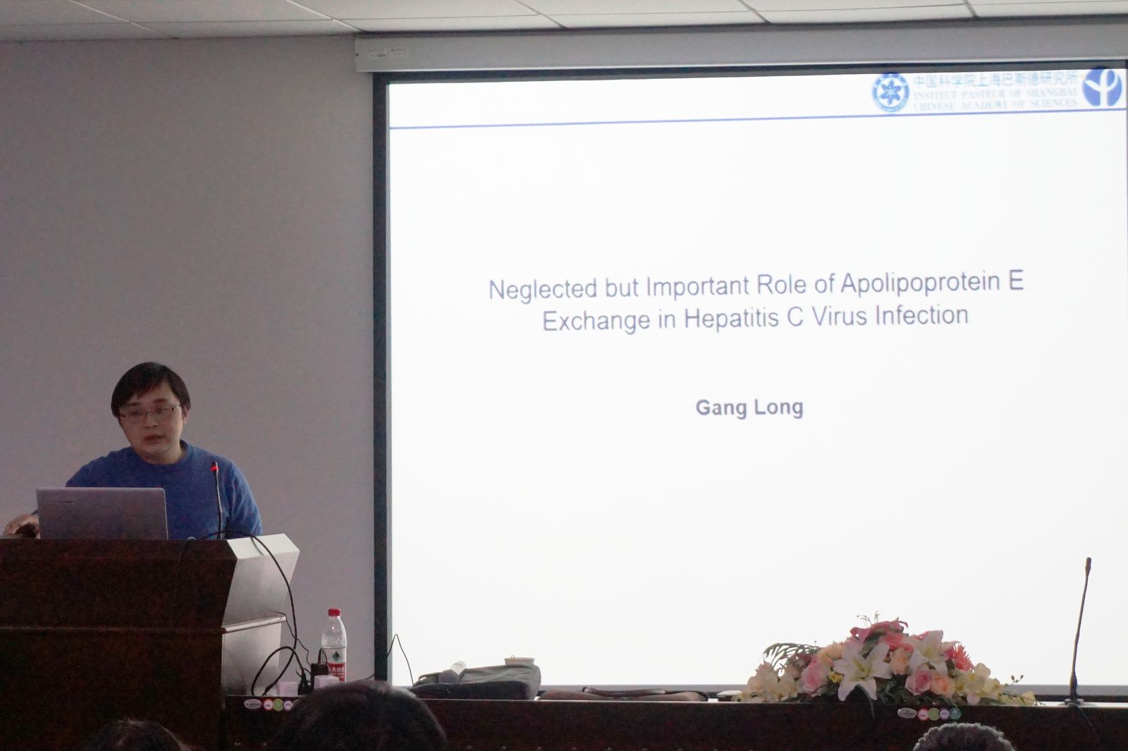 专题讲座环节,龙钢研究员以典型病毒HCV为例,通过对其入侵、复制、组装、扩散过程的深入讲解,在学生眼前展开一幅以时间为载体的生活史之图。借助丰富的图文介绍,龙钢研究员将病毒结构细化入微,以其形解其性,将五年研究历程娓娓道来,挫折与成果并存,带给学生对于生物学研究多角度、多方位的认识。进而在学生提问互动中以HCV病毒之性质功能引出其危害和防治,DAA抗病毒药物、抗生素基因插入、绿色荧光蛋白示踪等多种现代科技的巧妙应用令人耳目一新,为学生打开新的视野。