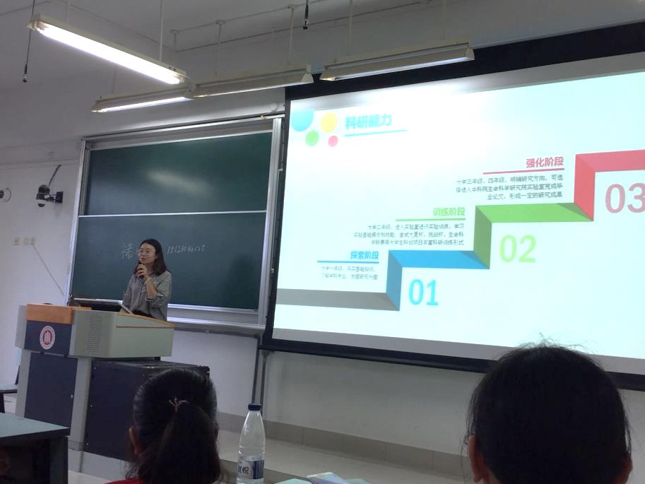 针对菁英班学生的科研能力培养分阶段进行。2016级菁英班学生处于科研探索阶段,主要通过基础课程夯实知识,通过参与学术讲座了解学科专业,通过实验室参观等活动体验科研氛围,发掘研究兴趣。2017年一共邀请了江文正、杜冰、叶海峰、马欣然、赖玉平、阳怀宇六位教授(研究员)为学生们开展走进学科组讲座,主要为生物化学与分子生物学领域,涉及免疫学、合成生物学等多个研究方向。