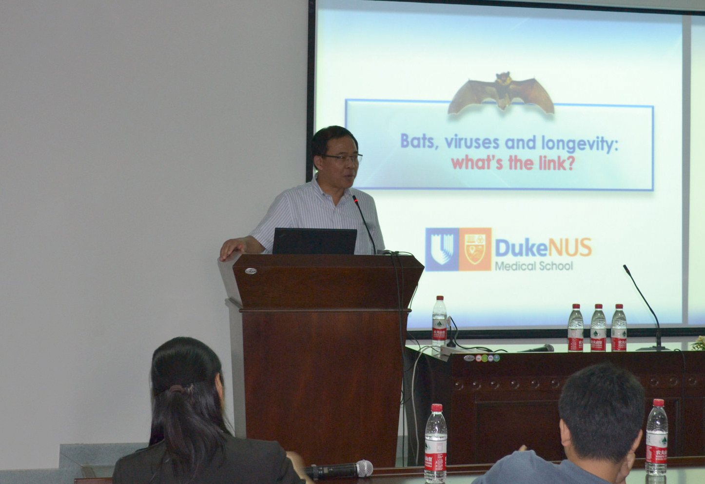 第二场学术报告由王林发院士主讲,王院士主要研究领域为新生感染性疾病领域,世界卫生组织专家,在过去的10年内,在Nature、Science、PNAS等世界超一流期刊上发表高水平论文10余篇,SCI论文100余篇,是这一领域杰出的科学家,他在SASRS溯源、追溯Hendra和 Nipah病毒与动物及人类的关系、蝙蝠分子免疫学等领域引领全球科学研究方向。此次讲座,王院士做了题为:“Bats, viruses and longevity: what’s the link?”,再次给师生们带来了全新的视角去审视蝙蝠这一古老的哺乳动物,提出了蝙蝠与病毒的“和平共处”与其长寿相关的假设及其一些分子机制,其风趣幽默的语言、引人入胜的讲座让师生们在笑声中拓展了视野。