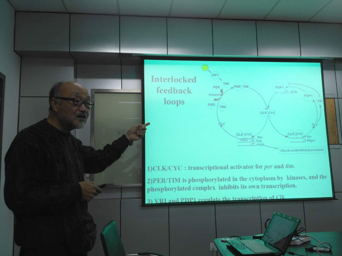 首先,何祝清工程师对竹田真木生教授及其学术内容做了大致的介绍,而后竹田真木生教授开始了他的讲座。教授先介绍了柞蚕(Antheraea pernyi)这种昆虫,并以短的光照时长诱导/保持滞育,而长的光照时长刺激化蛹这种现象来引出他的研究内容,即诱导和终止柞蚕蛹滞育的神经内分泌转换机制。这种现象的关键便是PTTH(促前胸腺激素)是否释放。教授通过一系列的证据展示了上游调控机制包含了吲哚胺调控通路:(1)光周期影响脑内5-羟色胺或褪黑激素的含量,(2)这些吲哚胺及其代谢酶共定位(3)注射褪黑激素能够终止蛹的滞育而luzindole(一种褪黑素受体拮抗剂)则能够保持蛹的滞育。光周期被认为是昼夜节律系统的一个功能。昼夜节律蛋白,PER,CLK,CYC的免疫组织化学反应(-ir)仅限于背外侧神经元,因此这些是昼夜节律神经元,与5-羟色胺受体,褪黑素受体和PTTH-ir并置。接着教授又用证据证明aaNAT能够调控这些基因。尤其是在加入NAT时,5-羟色胺含量随时间变化而不断降低,褪黑激素含量则随时间变化而不断升高,这时能够观察到PTTH的释放;当不存在NAT时,情况恰好相反。教授在这里用生动的语言进行了描述,PTTH的释放过程很像一个门控过程,NAT就像一把钥匙,能够打开门,从而引起PTTH的释放,因此在整个的通路过程中,NAT释十分关键的。随后教授又进一步阐述褪黑激素受体具有驱动Ca 2+动员的7-膜通过蛋白质,并且这些细胞具有PKC-和Rab8(小GPCR)-ir。Antheraea光周期系统的最后一个问题是“什么构成输入路径?竹田真木生教授通过RNAi研究了UVopsin,SWopsin和LWopsin,结果发现当注射SWopsin时,aaNAT转录遭到破坏,这表明SWopsin是光感受器。。最后,竹田真木生教授对整个的调控通路进行了总结,向我们展现了一个完整的诱导和终止柞蚕蛹滞育的神经内分泌转换通路。
