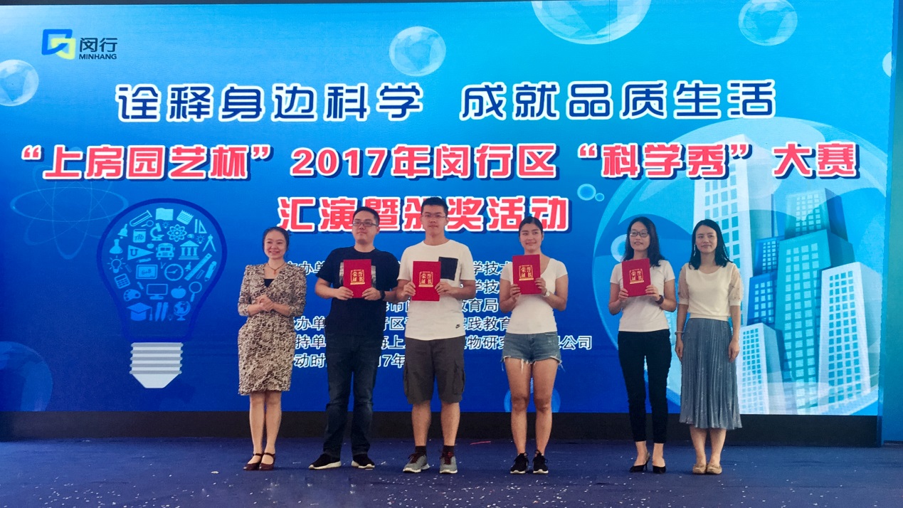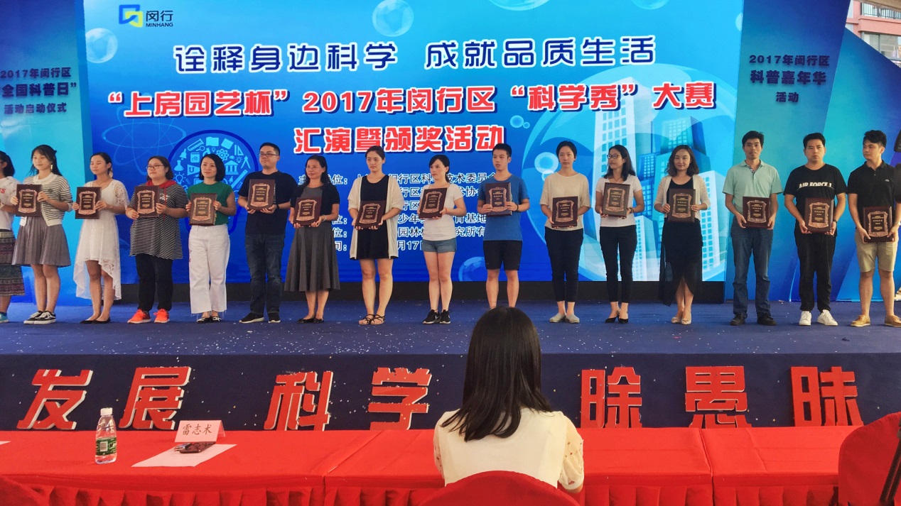 2017年9月17日下午,"上房园艺杯"2017年闵行区"科学秀"大赛颁奖仪式在马桥镇满天星广场举行。生科院科学商店作品捧得高校组唯一的一等奖,另外还获得二等奖两项,三等奖三项,同时获评“优秀组织奖”,创下历届最好成绩。