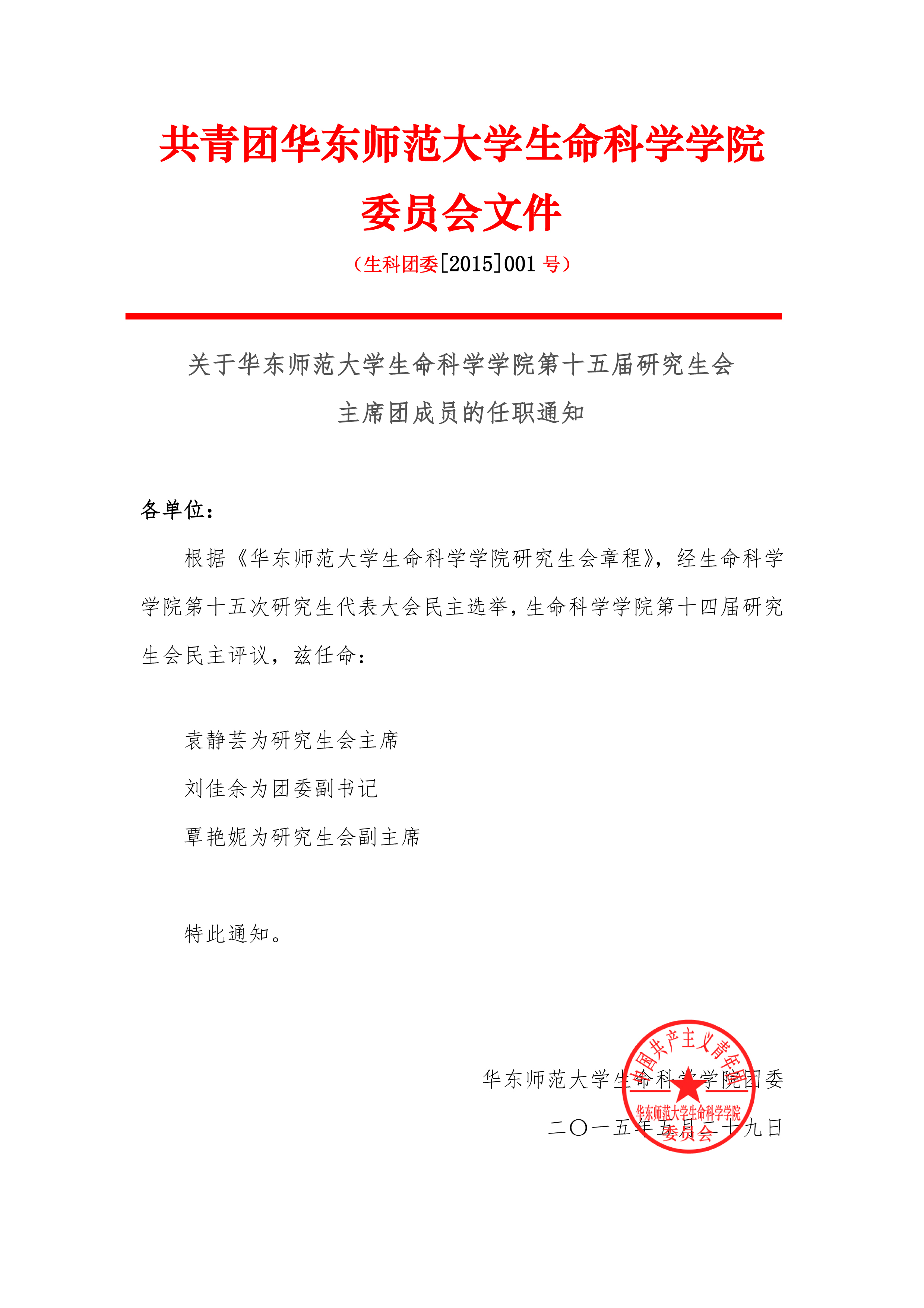 共青团秀人网 委员会文件(生科团委[2015]001号)