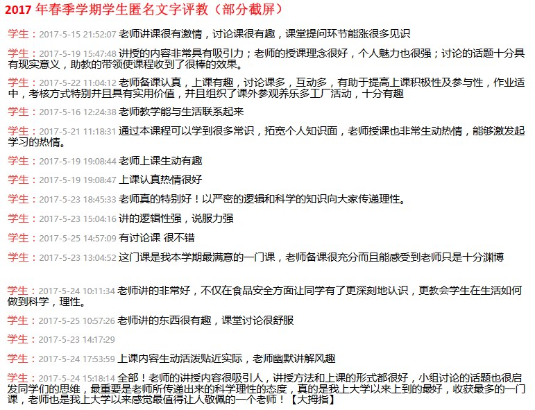 杜震宇教授的《启迪理性,融盐入汤-<食品安全与科学理性>通识课的课程思政创新与实践》和姜晓东教授的《游戏闯关和阅读分享:依托在线教学平台激发学生主动学习潜能》双双获得2017年度教学成果二等奖。